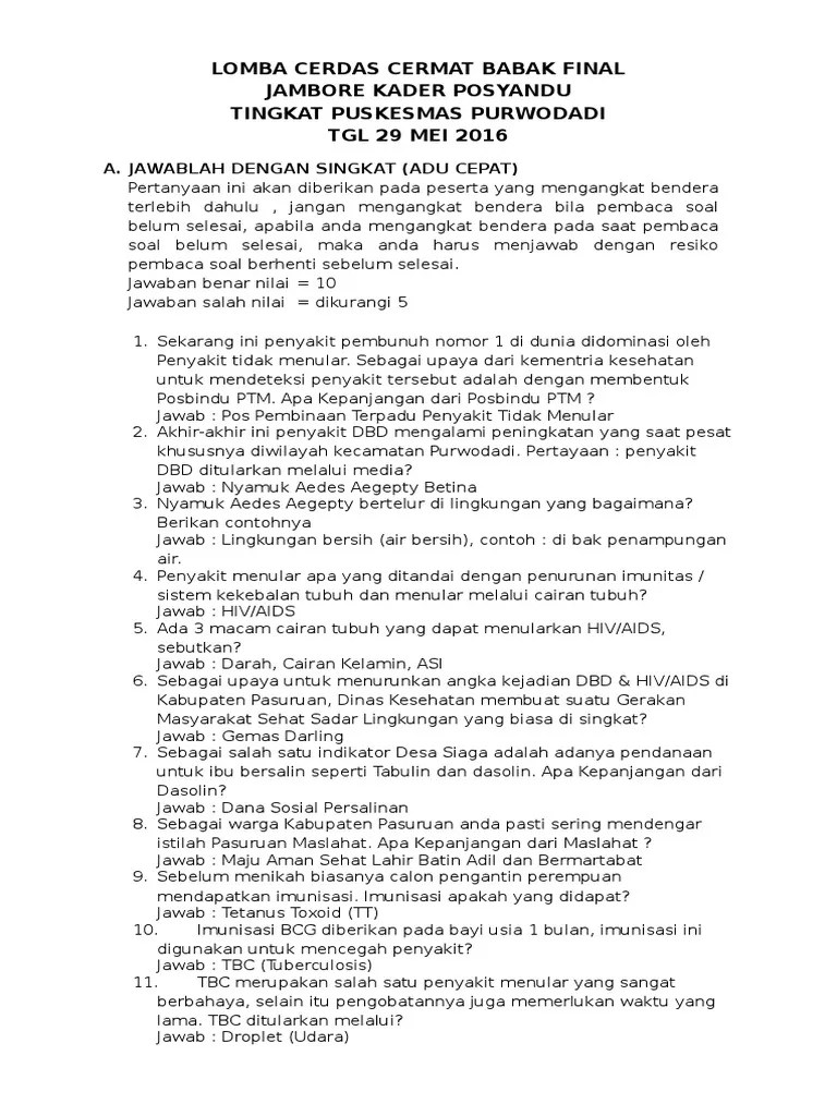 8172019 soal dan jawaban cerdas cermat kader posyandu 12 1 soal dan jawaban cerdas cermat kader posyandu 1. Disini saya akan memberikan contoh soal cerdas cermat atau lct bahasa inggris sma. Soal pendidikan agama islam atau pai untuk kelas 1 sd kurikulum 2013 akan kami sajikan di halaman ini. Di meja keberapakah i!akka# pe#imba#$a#% . Sila ke dua dari pancasila dilambangkan dengan gambar apa ?